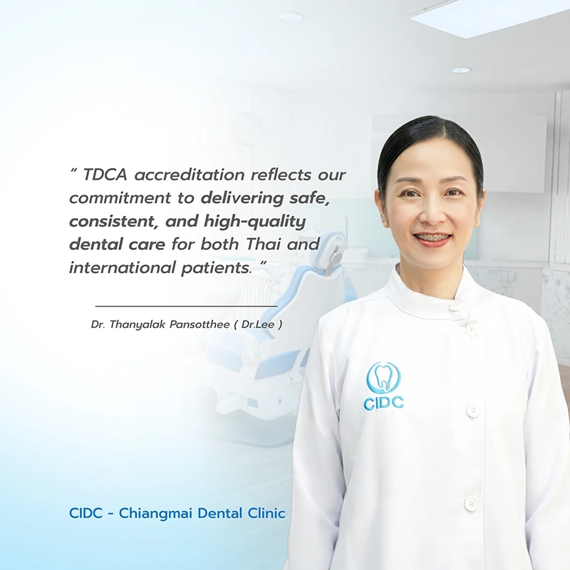 เชียงใหม่ เดนทัล คลินิกทันตกรรม (CIDC) ผ่านการตรวจประเมินตามเกณฑ์ Thai Dental Clinic Accreditation (TDCA) เมื่อวันที่ 20 เมษายน 2569 ซึ่งเป็นมาตรฐานการรับรองคลินิกทันตกรรมในประเทศไทย ภายใต้การกำกับดูแลของทันตแพทยสภา เพื่อยืนยันถึงคุณภาพการรักษา ความปลอดภัยของผู้ป่วย และระบบบริหารจัดการที่ได้มาตรฐานระดับสูง